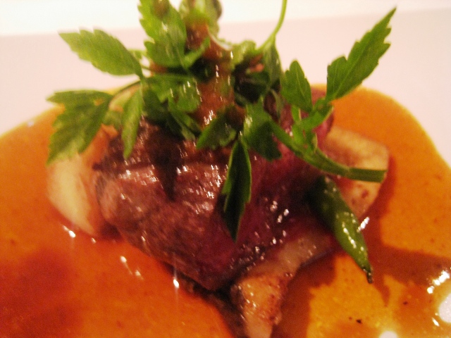 「フランス シャラン産 鴨胸肉のロースト 伏見トウガラシとセリを添えて」