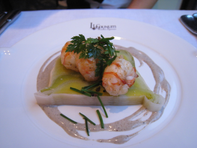 ポロねぎのテリーヌと手長海老のロティトリュフドレッシング