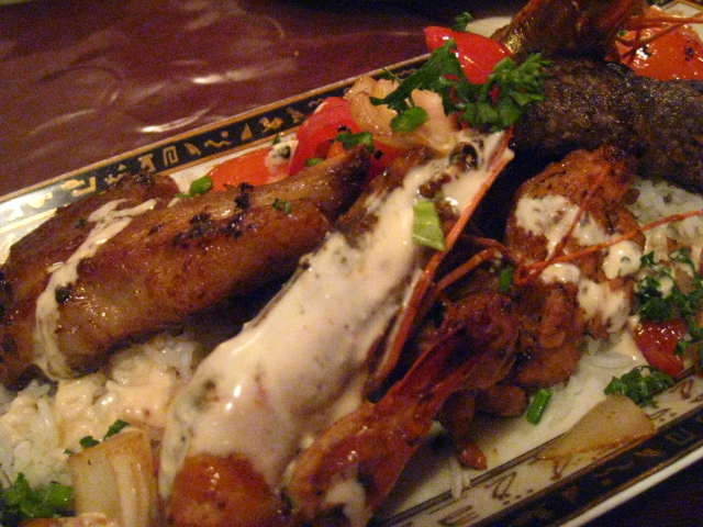 海老と牛肉のシシカバブーと鶏肉のグリル