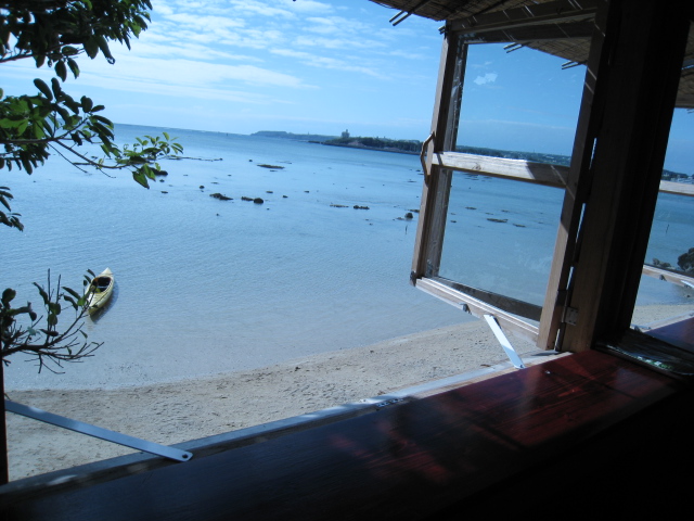 カフェと開け放たれた窓から見える蒼い海