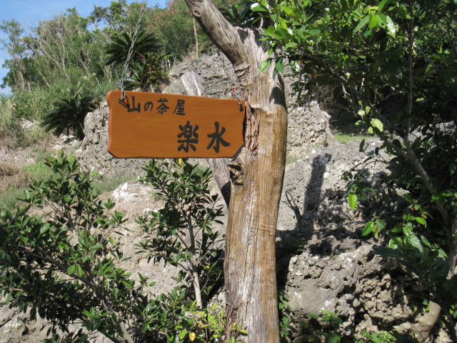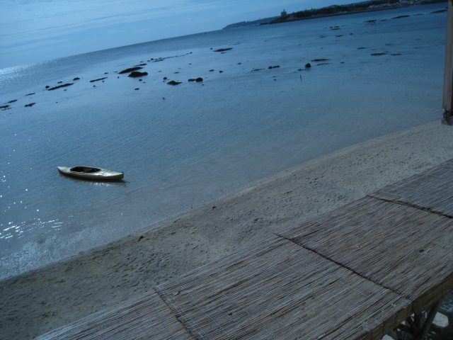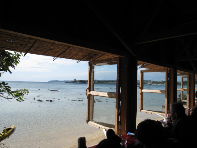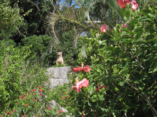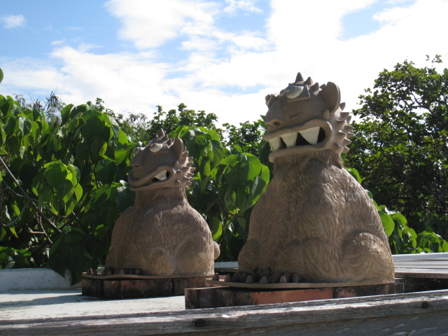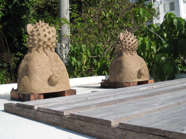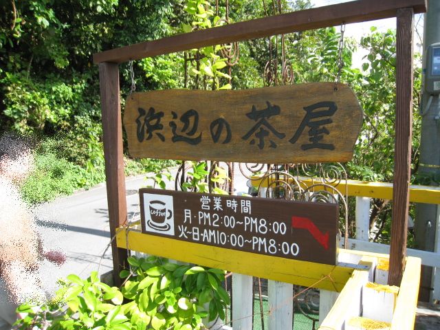 」です、このカフェここ「浜辺の茶屋」入口では可愛いシーサーがお出迎え