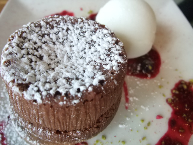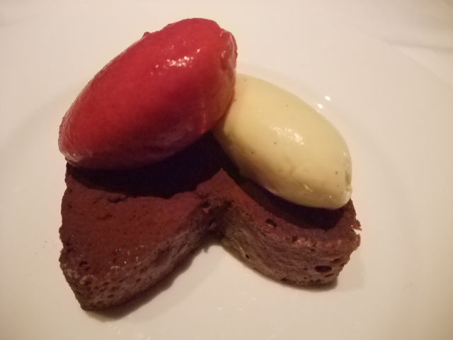 『温かいチョコレートスフレ・ベリーソースとヨーグルトのソルべ』