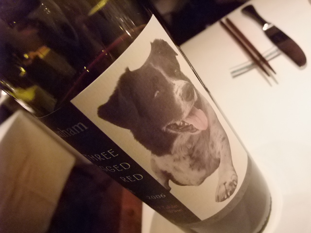 次のお肉料理はもちろん赤ワイン、可愛い犬のラベルにほんわか気分。