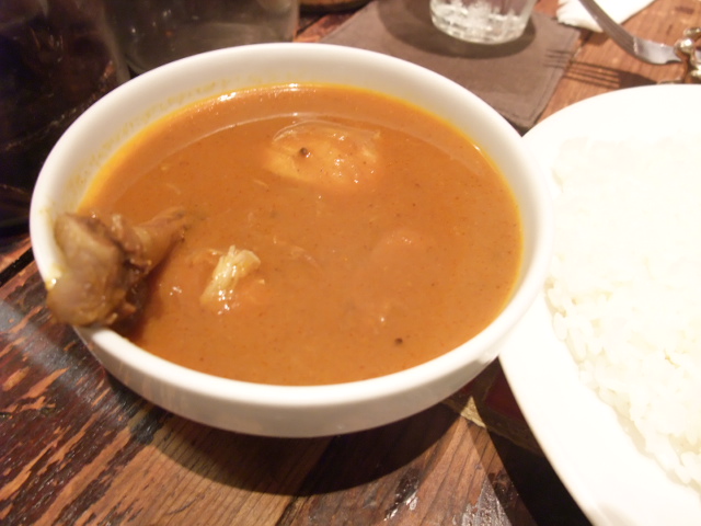 チキンカレー、骨付きのチキンが入ってます。味は中辛、でも子供でもOK