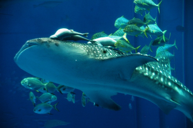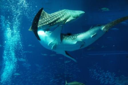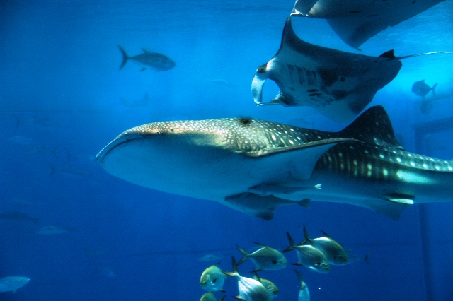 「黒潮の海」ではジンベイザメやマンタが優雅に泳ぎ、マグロやカツオの泳ぎは力強くって泳ぎも早いジンベイザメはグルグルと水槽内を泳いでいる~