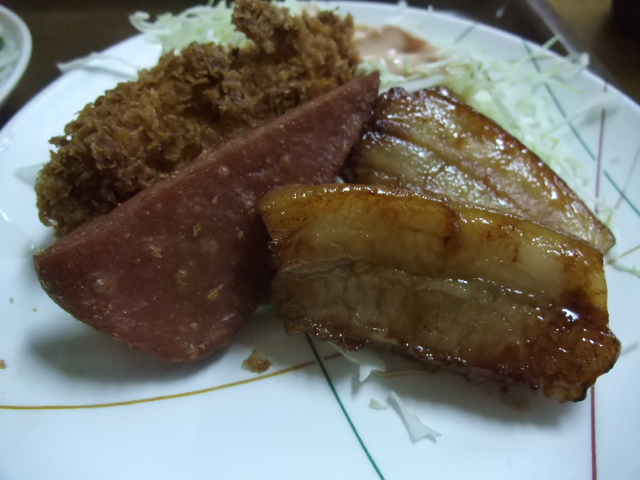 豚の三枚肉やらスパムやらスパムの揚げもの、そして。